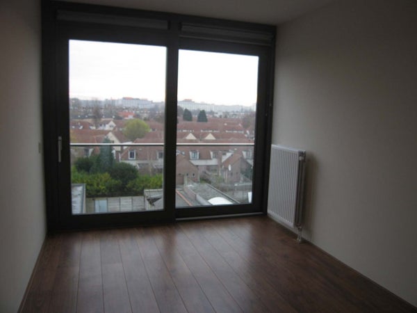 Woonkamer met grote ramen en schuifpui met Frans balkon en uitzicht over de Woenselse Markt.