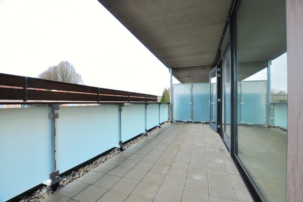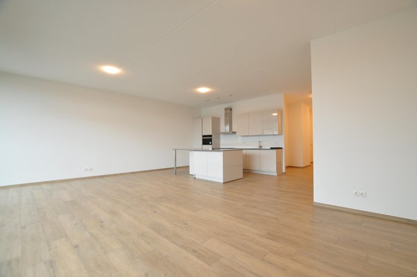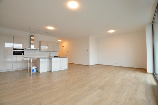 Appartement: Entree appartement. Ruime woonkamer met openslaande deuren naar het balkon en een open keuken met inbouwapparatuur. Het balkon loopt over de volle breedte van de achterkant van het appartement.
