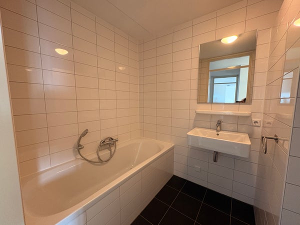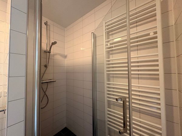 De badkamer is volledig betegeld en modern afgewerkt. U vindt hier een ruime inloopdouche, ligbad en wastafel.