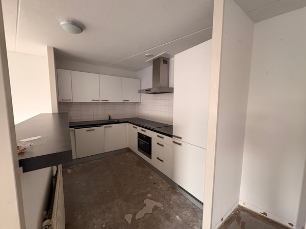 Ruime woonkamer met open keuken met een fraaie natuurlijke lichtinval door de grote raampartijen. De woonkamer is dusdanig ruim dat er plek is voor een grote zithoek en eettafel. Vanuit de woonkamer ook toegang tot het balkon.