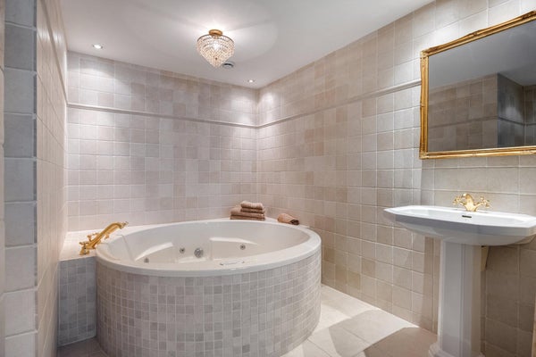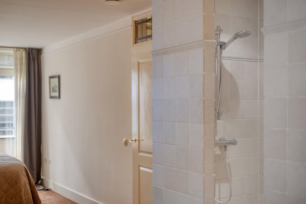 Ruime ouderslaapkamer van circa 16m2 v.v. 2-persoonsbed en ensuite badkamer v.v. zeer ruim meerpersoons ligbad/jacuzzi, wastafel en separate douche. De tweede slaapkamer is momenteel in gebruik als studeerkamer en is v.v. een bureau en ruime linnenkast.