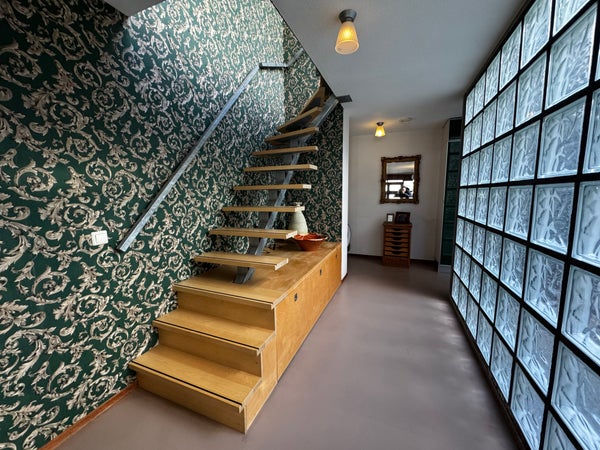 Gezellige hobby/multifunctionele ruimte met werkplek. Hal met trap en toegang tot een ruimte met wasmachine, droger en vaste kasten.