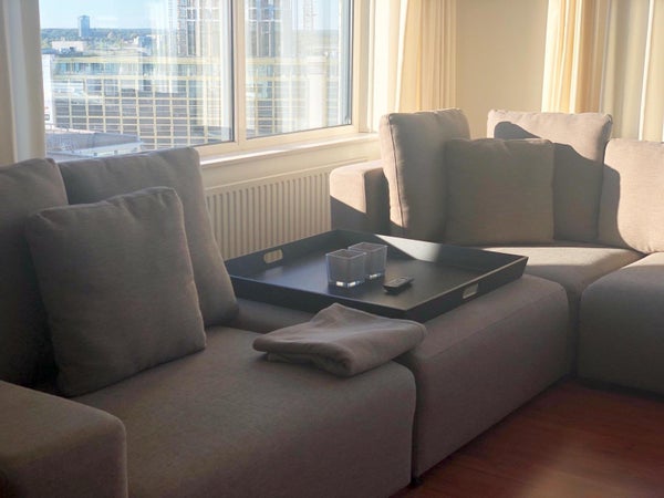 Ruime, luxe ingerichte living met fraai uitzicht over de stad, voorzien van een moderne zithoek en een eethoek.