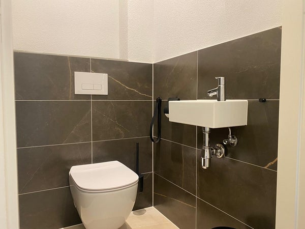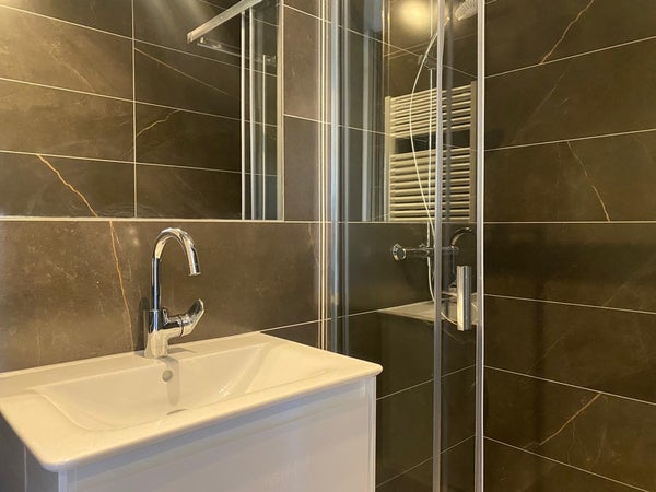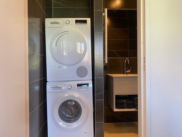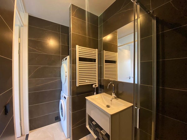 De moderne badkamer is voorzien van een ruimte douche, wastafelmeubel met opbergruimte, wasmachine en droger. Door de grote vloertegels en donkere wandtegels heeft de badkamer een luxe uitstraling.