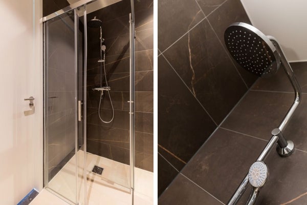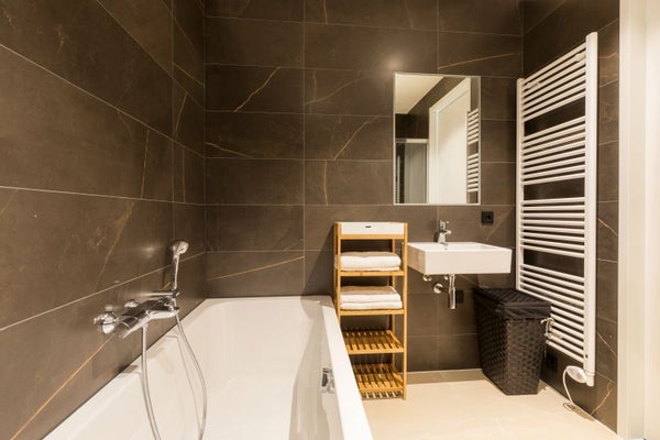 De badkamer is netjes afgewerkt en voorzien van een ligbad en een ruime inloopdouche
