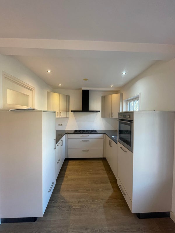 • Een vaste trapopgang leidt naar de eerste verdieping, waar de ruime woonkeuken zich bevindt. Deze keuken is voorzien van alle benodigde inbouwapparatuur, inclusief een 5-pits gasfornuis, vaatwasmachine en voldoende boven- en onderkasten voor optimale opbergruimte.