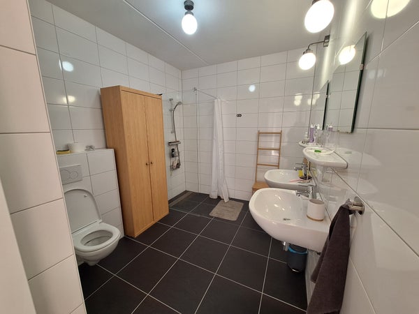 • (Deels) betegelde badkamer voorzien van douche, toilet en dubbele wastafel;