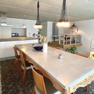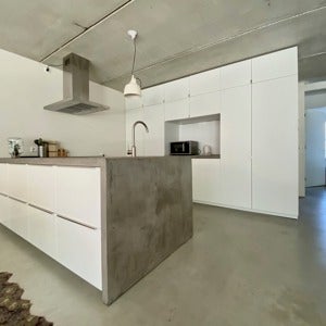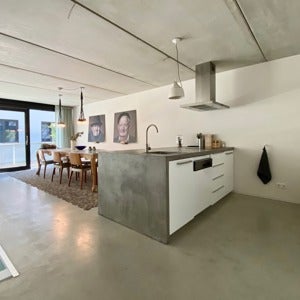 Fraaie eet/woonkeuken met betonnen vloerafwerking voorzien van vloerverwarming, wit stucwanden, schuifpui naar ruim dakterras en zwevende werkruimte (7,5 m2) met houten vloer.
