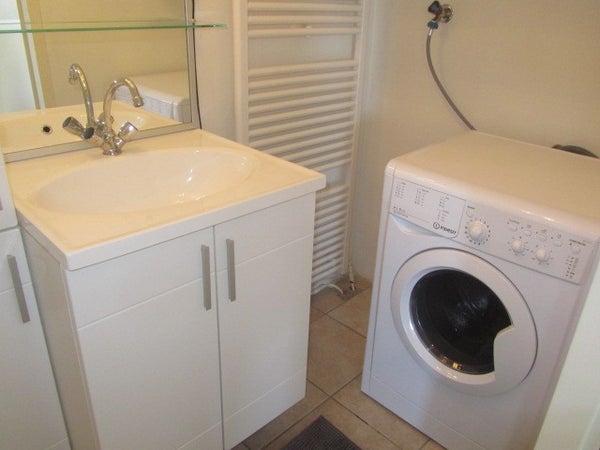 Badkamer welke is voorzien van wastafel met spiegel, douche en een wasmachine.