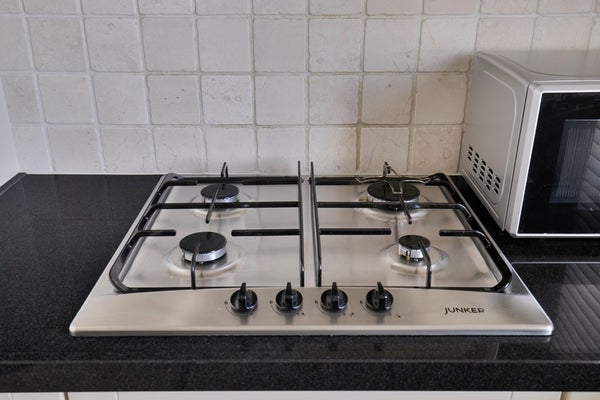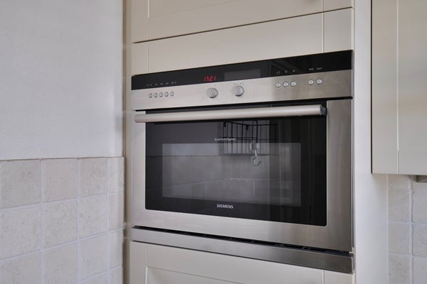 De keuken in hoekopstelling is voorzien van diverse inbouwapparaten, Denk hierbij aan een 4-pits gaskookplaat, een inbouwoven, inbouwkoelkast en vaatwasser. De muren zijn tot zeker 1.20 hoogte betegeld met een licht beige tegel.