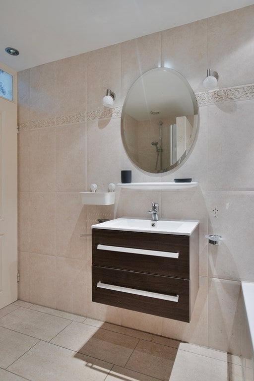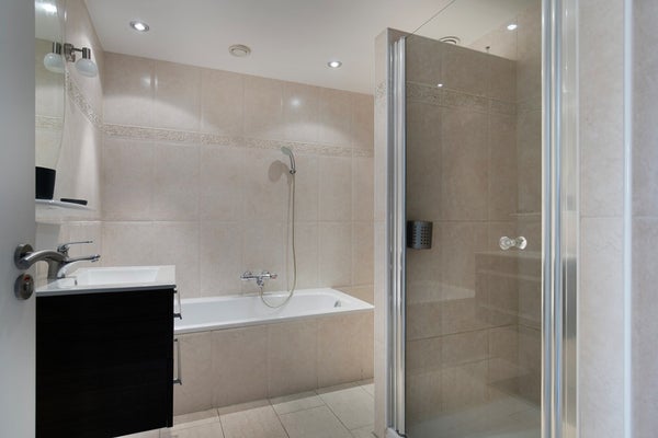 De badkamer beschikt over een douchecabine, ligbad en een wastafel met meubel. Ook zijn er diverse accessoires aanwezig zoals een planchet, spiegel, handdoekhouders en verlichting.