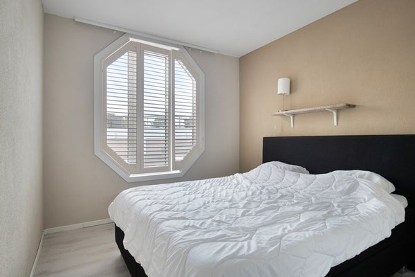 De tweede slaapkamer gelegen aan de voorzijde van de woning is voorzien van een laminaat vloer en een gordijnrails. De slaapkamer is gemeubileerd met een tweepersoonsbed en diverse opbergmogelijkheden.