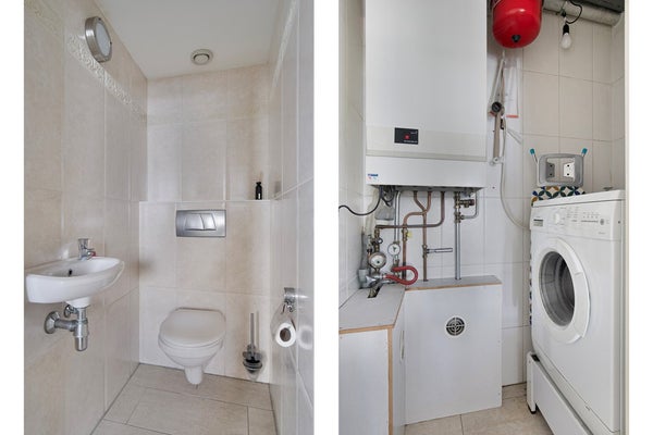 Het apart toilet is voorzien van een hangend closet, fonteintje, volledig betegelde wanden en diverse accessoires.