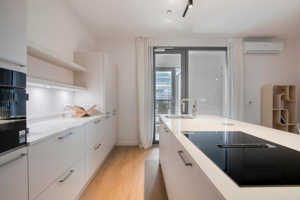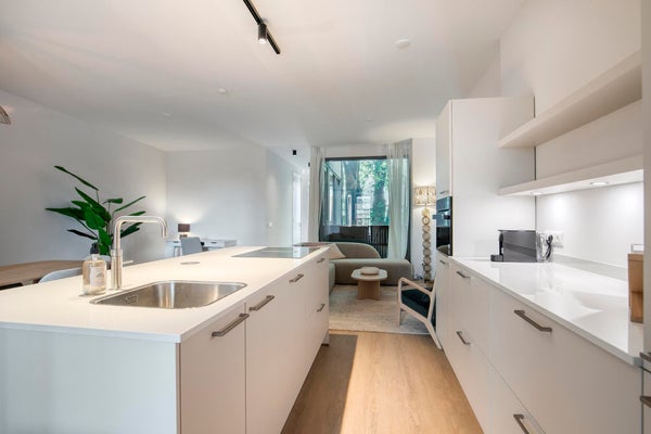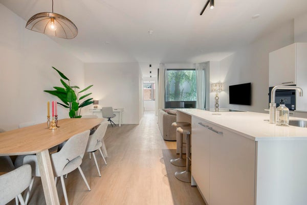 Het gemeubileerde appartement is voorzien van een ruime woonkamer (voorzien van airco) met een luxe open keuken, uitgerust met hardstenen keukenblad en voorzien van elektrische inductiekookplaat met geïntegreerde afzuiging, Quooker, vaatwasser, koelkast, vriezer en oven-magnetron combinatie (allen Siemens/Bosch apparatuur).