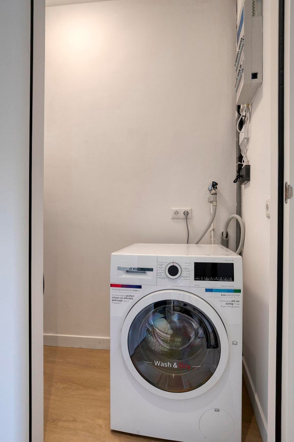 De aparte inpandige bergruimte is uitgerust met een was-/droogmachine en voorzien van een stofzuiger, strijkijzer en strijkplank.