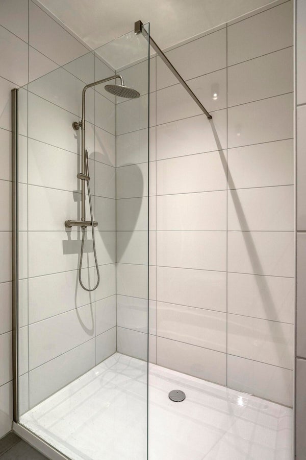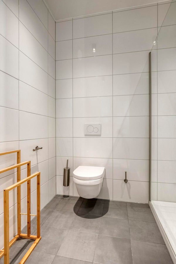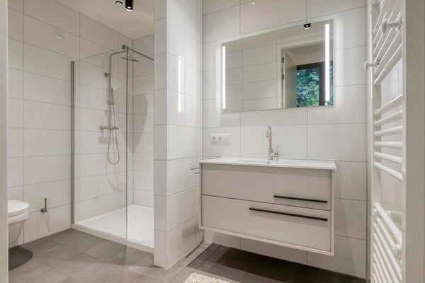 De badkamer is afgewerkt met natuurstenen tegelwanden en heeft een luxe uitstraling. De ruimte is voorzien van een ruime inloop douche, wastafelmeubel en een toilet.
