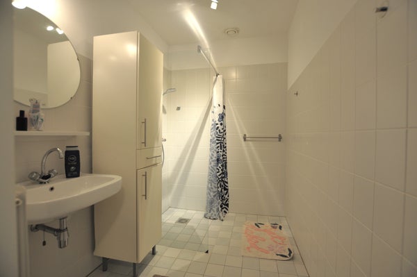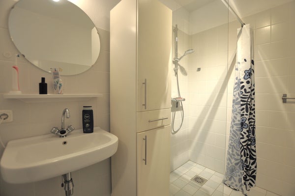 Badkamer voorzien van royale inloopdouche en wastafel met voldoende opbergmogelijkheden.