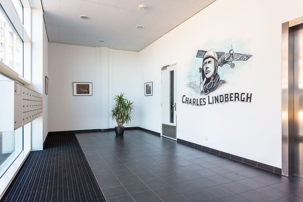 Ruime, centrale hal met bellenplateau, brievenbussen, lift en trappenhal.