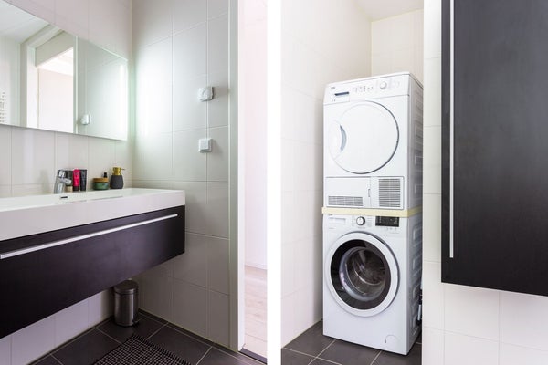 De moderne, geheel betegelde badkamer beschikt over een douchecabine en brede wastafel in meubel. Tevens is hier de aansluiting voor de wasapparatuur gesitueerd.