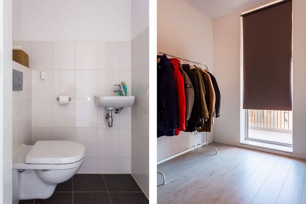 Aan de overzijde van de badkamer bevindt zich de toiletruimte, welke voorzien is van een hangend closet en fonteintje.