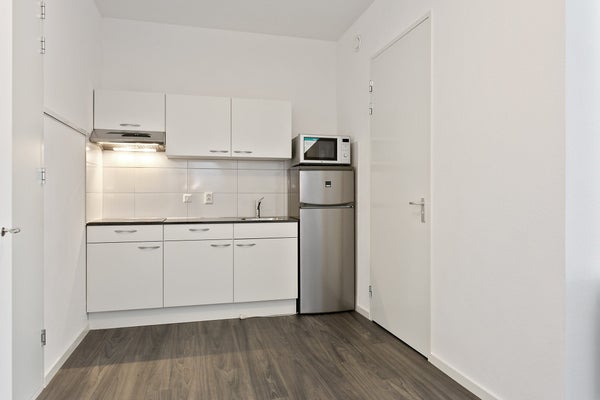 Entree in het appartement met aan de rechterzijde de moderne open keuken voorzien van composietwerkblad, combi-oven, koelkast met vriesvak, inductie kookplaat, afzuigkap en boven- en onderkasten met ‘soft close’ mechanisme. Toegang tot de badkamer, welke de keuken van het woon/zitgedeelte scheidt. Volledig betegelde badkamer voorzien van mechanische ventilatie, douche cabine, wastafel en toilet. Tevens is er een aansluiting aanwezig voor de wasmachine.