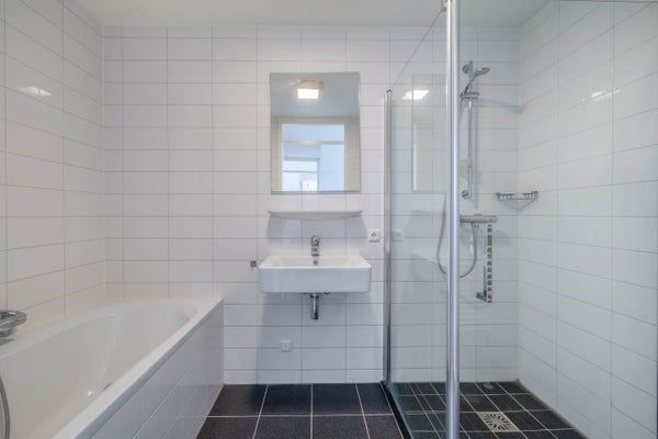 De badkamer is volledig betegeld en modern afgewerkt. U vindt hier een ruime inloopdouche, ligbad en wastafel.