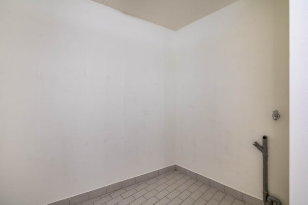 De toiletruimte is deels betegeld en voorzien van een vrijhangend toilet en een fonteintje.