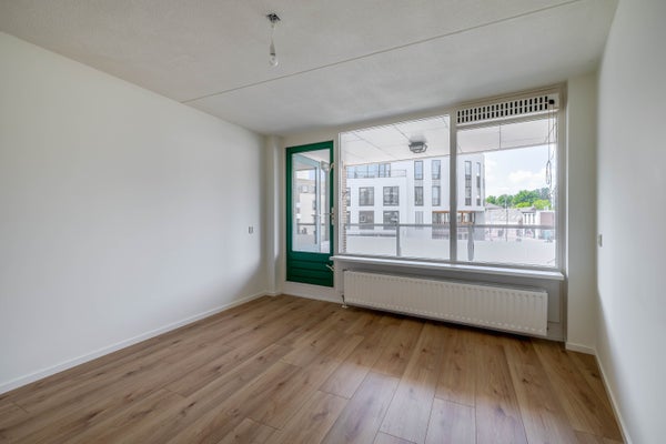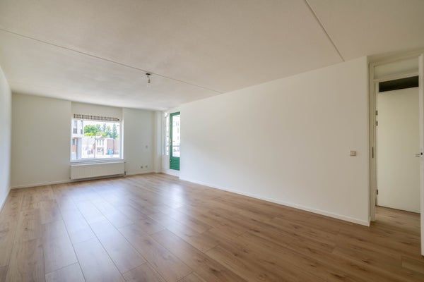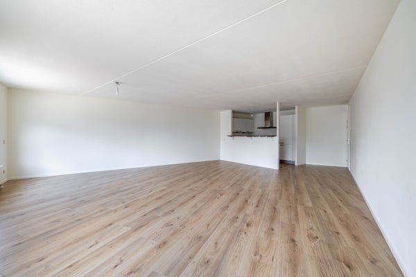 Ruime woonkamer met open keuken met een fraaie natuurlijke lichtinval door de grote raampartijen. De wanden en plafond zijn recent geschilderd en strak afgewerkt en ook ligt er een compleet nieuwe vloer.