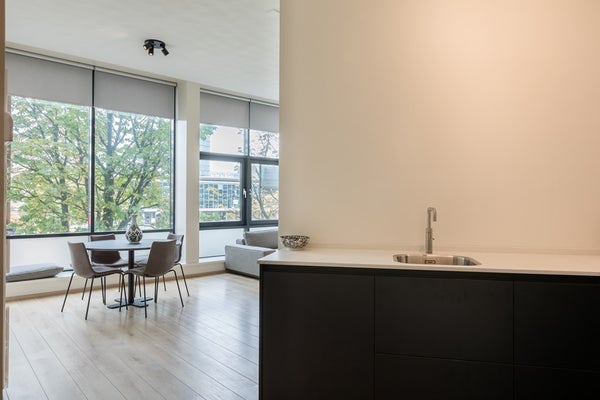 De woonkamer is v.v. laminaat en gelegen aan de voorzijde, vele raampartijen met uitzicht over het station. De half open keuken is v.v. inbouw apparatuur. Separate betegelde toilet met wastafel.