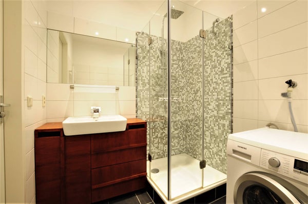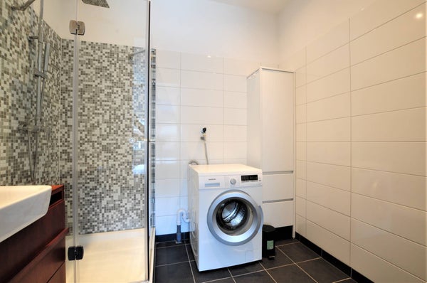 Vanuit hier kunt u ook naar de badkamer toe, waar een douchecabine, wastafel en de wasmachine te vinden is. Het toilet is individueel te bereiken.
