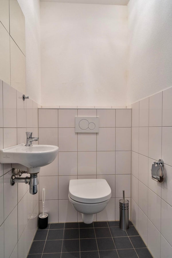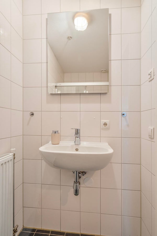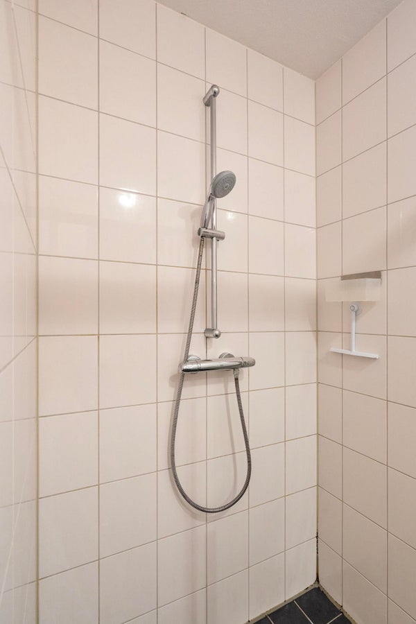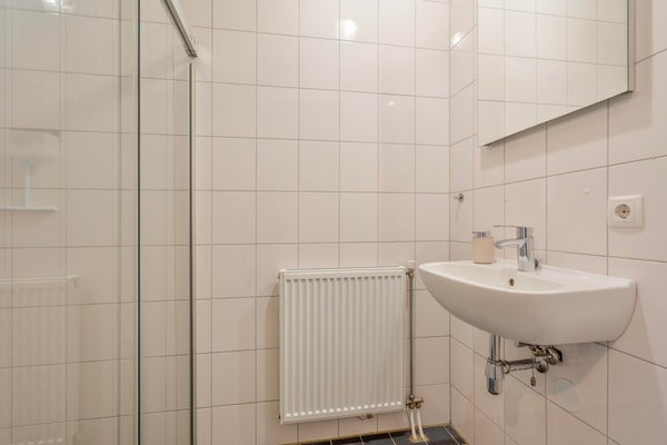 Nette badkamer voorzien van douche, wastafel en spiegel. Hoogwaardig betegeld en goed onderhouden.