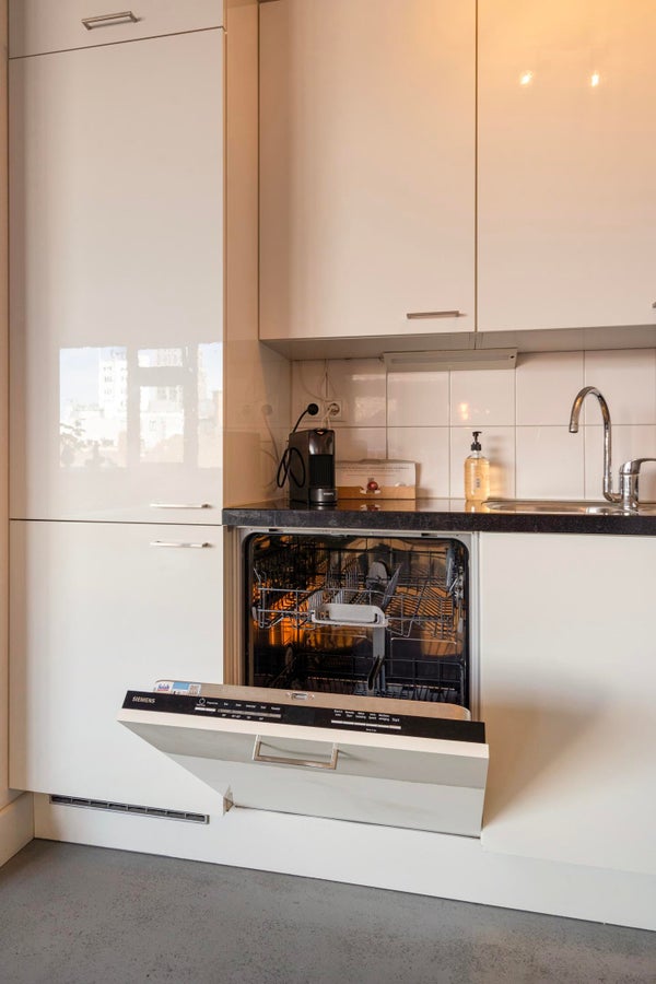 Open keuken voorzien van inbouwapparatuur, waaronder een kookplaat, oven, vaatwasser, koelkast en Nespresso-apparaat. Praktisch en volledig uitgerust.