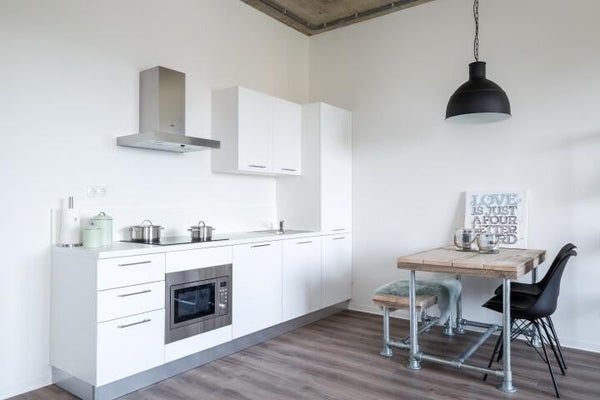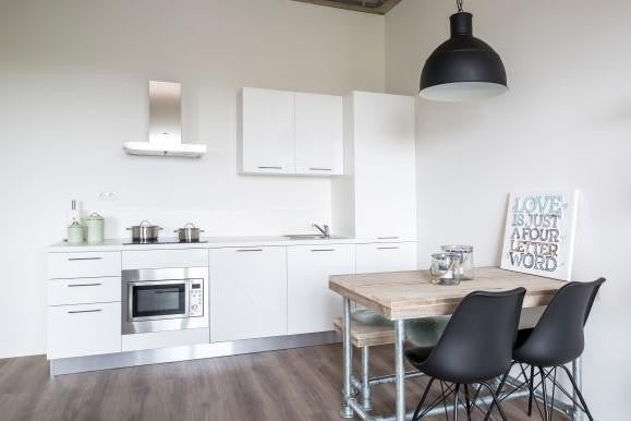 Het appartement beschikt over een open woonkamer en keuken. De moderne hoogglans witte keuken is voorzien van een keramische kookplaat, RVS afzuigkap, spoelbak met mengkraan, koelkast met grote vriezer, vaatwasser en magnetron/oven combinatie.