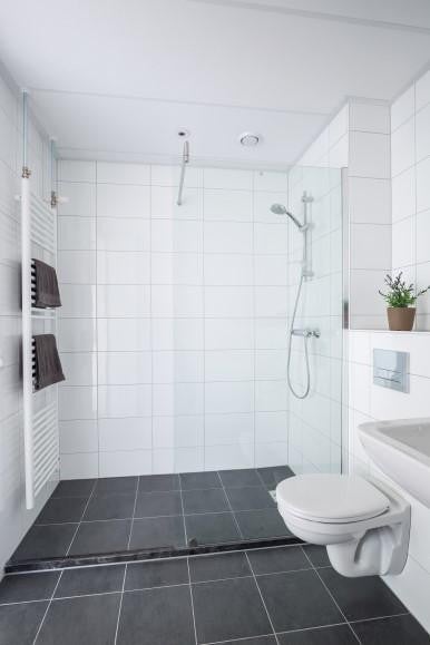 Vanuit de woonkamer zijn de slaapkamer en badkamer bereikbaar. De Volledig betegelde badkamer is voorzien van een hoogglans witte wandtegel en antracieten vloertegel. De luxe badkamer is uitgerust met een inloopdouche met mengkraan, designradiator, wastafel en hangcloset en wasmachine.