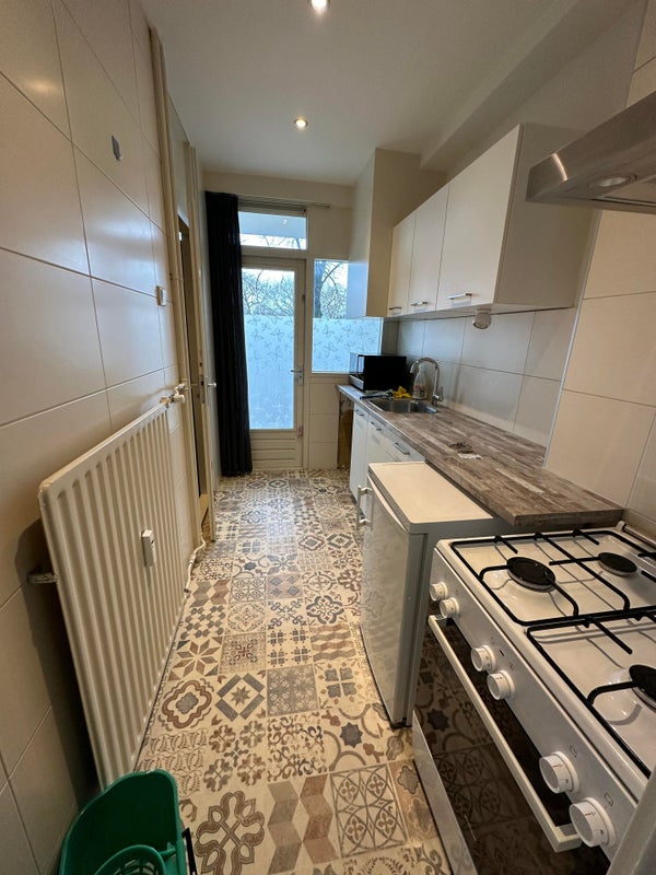 De keuken is geheel gerestyled en beschikt over voldoende kastruimte, een aanrechtblad met RVS-spoelbak, koelkast, gasfornuis met oven en afzuigkap.