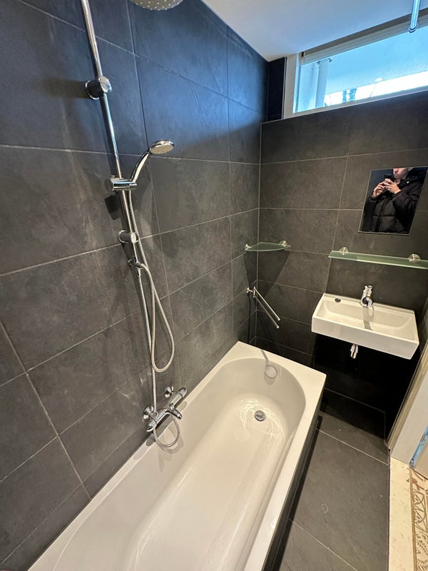 Moderne, geheel gerenoveerde en geheel betegelde badkamer met een bad/douchecombinatie, wastafel en toebehoren.
