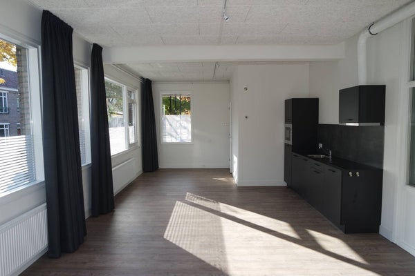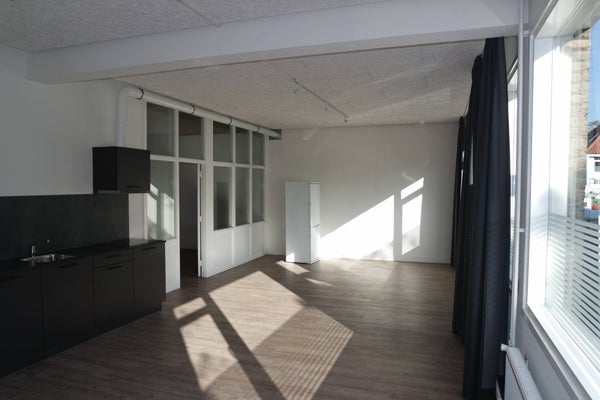 Entree in hal van het appartement met toegang tot trap naar de atelierruimte in de kelder. Separaat toilet op de hal. Doorgang naar de woonkamer met open keuken. Ruime woonkamer van ca. 30 m² met grote raampartij aan de voorzijde met veel lichtinval. Nieuwe luxe keuken voorzien van vaatwasser, koelkast met vriezer, afzuigkap, inductie kookplaat en combi magnetron. Separate slaapkamer van ca. 12 m². De slaapkamer geeft toegang tot de zeer ruime badkamer. De volledig betegelde badkamer is voorzien van wastafel met meubel, ruime inloopdouche en wasmachine aansluiting.