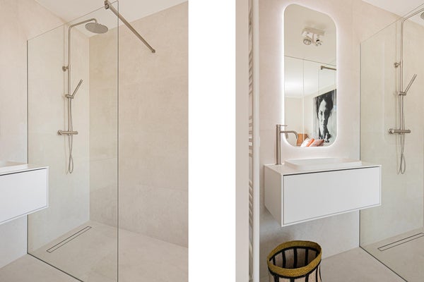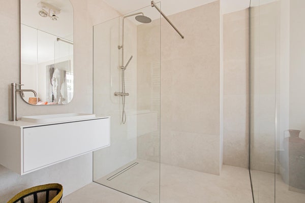 Badkamer met inloopdouche en badmeubel/wastafel.