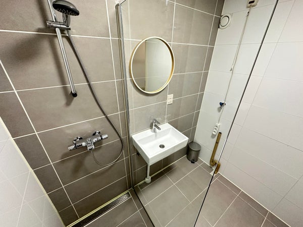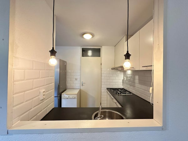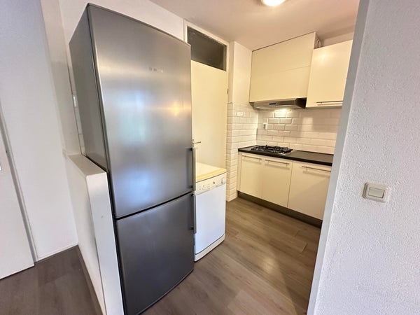 De badkamer is voorzien van inloopdouche, wastafel en wasmachine aansluiting. Separaat toilet met fonteintje. Doorgang naar ruime woonkamer en toegang tot de open keuken. De keuken is voorzien van de volgende apparatuur: vaatwasser, 4-pits gaskookplaat en koel/vriescombinatie. De woonkamer geeft toegang tot het balkon.