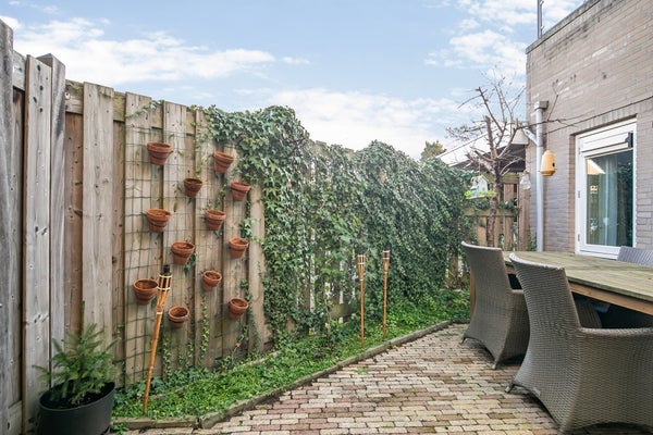Achtertuin met terras, en achterom. Direct erachter ligt de overdekte parkeerplaats.