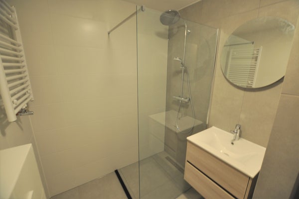 Moderne badkamer voorzien van toilet, inloopdouche en aansluiting voor de wasmachine.