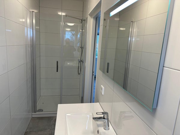 Complete luxe badkamer met inloopdouche, wastafelmeubel met spiegel en verlichting, wasmachine aansluiting.