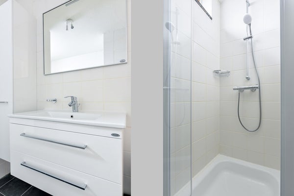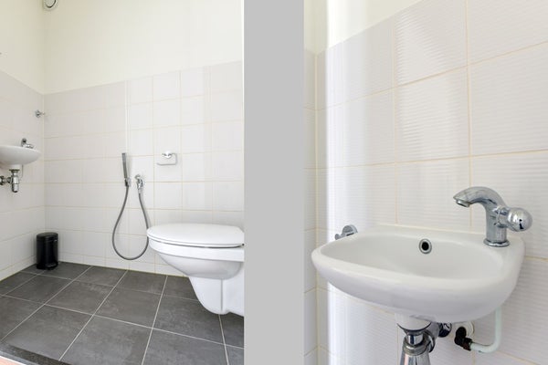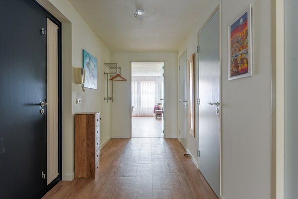 De ruime hal is voorzien van een videofoon installatie, laminaatvloer, geheel witte wanden, een fijn spuitwerk plafond en een eigen meterkast welke voorzien is van 5 groepen en 2 aardlekschakelaars. Een aparte hangend toilet voorzien van een tegelvoer, de wanden zijn voor de helft betegeld, een fonteintje en mechanische ventilatie. Een volledig betegelde badkamer welke voorzien is van een fijn spuitwerk plafond, wastafel, radiator met thermostaatkraan, douchecabine met een mengkraan en douchegordijn, een ligbad met mengkraan, mechanische installatie en de badkamer is voorzien van daglicht.