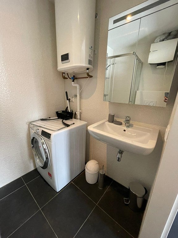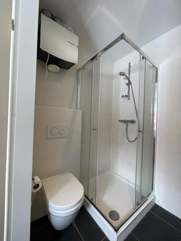 De badkamer is betegeld en is ingericht met een douche, toilet, wastafel en wasmachine/droog combi.