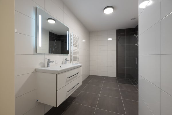 Bij binnenkomst wordt u verwelkomd door een hal die toegang biedt tot twee slaapkamers, een apart toilet en een moderne badkamer. Daarnaast leidt de hal naar een handige berging en een sfeervolle woonkamer. Het gehele appartement, met uitzondering van de natte ruimtes, is voorzien van een stijlvolle PVC-vloer met houtlook, wat zorgt voor een warme en elegante uitstraling. De open woonkamer is ruim en licht dankzij de grote ramen van vloer tot plafond, een unieke vondst in deze gewilde wijk. Dit biedt een heerlijke buitenruimte waar u kunt ontspannen en genieten van de dynamische omgeving. De moderne keuken is volledig uitgerust met hoogwaardige inbouwapparatuur, waaronder een inductiekookplaat, koel-vriescombinatie, oven en vaatwasser. Het strakke kookeiland maakt de keuken perfect voor zowel koken als gezellig samenzijn. De badkamer heeft een eigentijdse uitstraling, afgewerkt met grote antracietgrijze tegels, een dubbele wastafel en een luxe inloopdouche.
