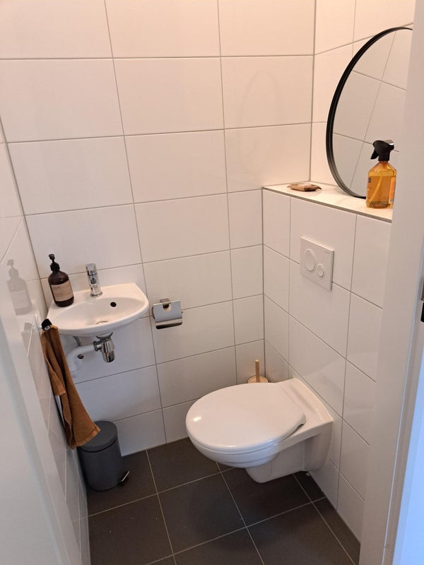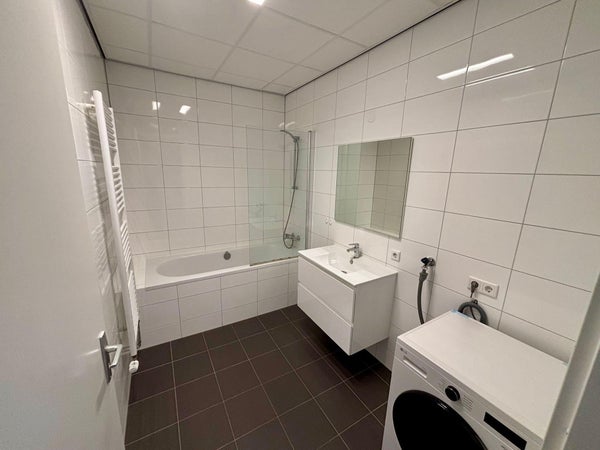 Volledig betegelde badkamer met bad-douche, badmeubel met 2 softclose lades, handoek radiator, toilet en was- droog combinatie machine.