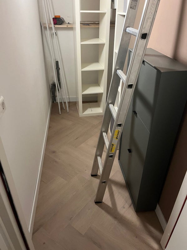 In de technische ruimte vind je de cv-ketel, ventilatie-unit en de aansluiting voor de wasmachine. Vanuit hier bereik je via een ladder de mezzanine van circa 12 m². Deze extra ruimte is ideaal als slaap- of opbergruimte, maar let op: de hoogte is beperkt, waardoor geheel rechtop staan niet mogelijk is.