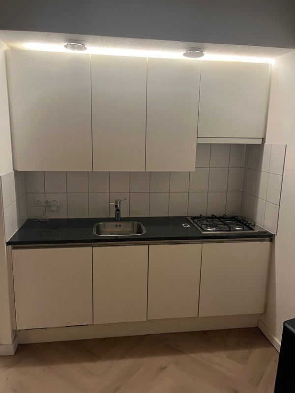 Bij binnenkomst stap je in de hal, die toegang biedt tot de badkamer, het aparte toilet, de woonkamer met open keuken en de technische ruimte. De badkamer is voorzien van een douchecabine en een wastafel met spiegel, het toilet apart is gesitueerd. De woonkamer voelt ruim en licht dankzij het hoge plafond en de grote ramen. De open keuken is praktisch ingericht en uitgerust met een koelkast, 4-pits gasfornuis, afzuigkap, kleine vaatwasser, wasbak en voldoende kastruimte.