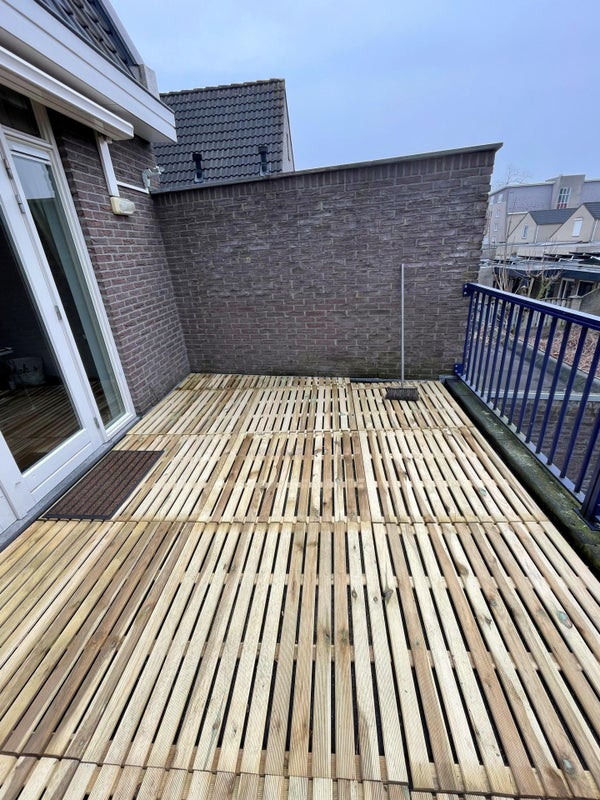 Ruime woonkamer in L-opstelling en ramen aan weerszijden. Middels openslaande deuren kunt u het dakterras bereiken welke tot het zuidwesten is gericht en zodoende veel zonuren biedt.