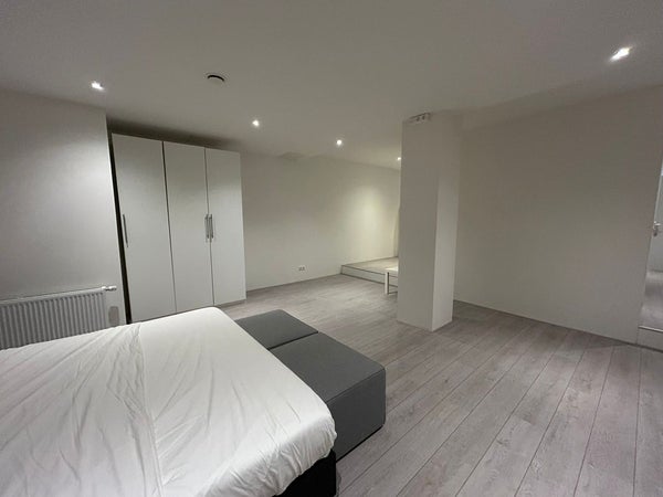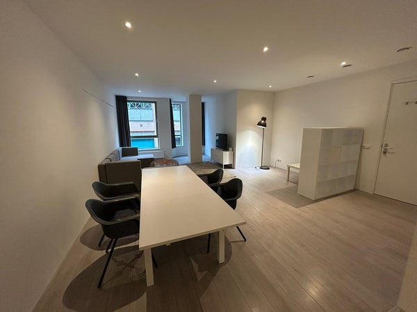De ruime woonkamer vormt het hart van de studio en biedt voldoende mogelijkheden voor zowel een comfortabel zitgedeelte als een aparte eethoek. Dankzij de grote raampartijen geniet de ruimte van veel natuurlijk licht en een uitzicht op de winkelstraat, wat zorgt voor een levendige en stedelijke sfeer.